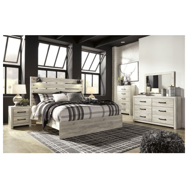 What a delightful take on rustic industrial style. Whether modern loft or modern farmhouse, this king panel bed makes itself at home. The wispy whitewash palette enhances without covering the grain for that weathered look you crave. Love to read in bed? You’re sure to find the retro-chic light sconces and USB plug-ins on the open-slat style headboard such a bright idea. This group includes king bed, dresser, mirror and night stand.