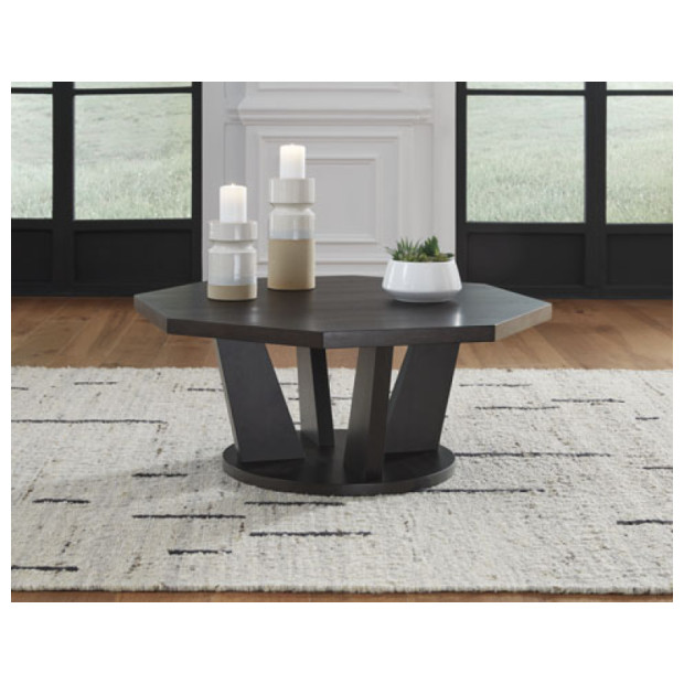 For the ultimate in casual contemporary styling, accent your sofa or loveseat with this chic coffee table. Designed with an octagonal top and trapezoid-shaped legs, its geometric elements create a bold, eye-catching look. Includes coffee table and 2 end tables.
