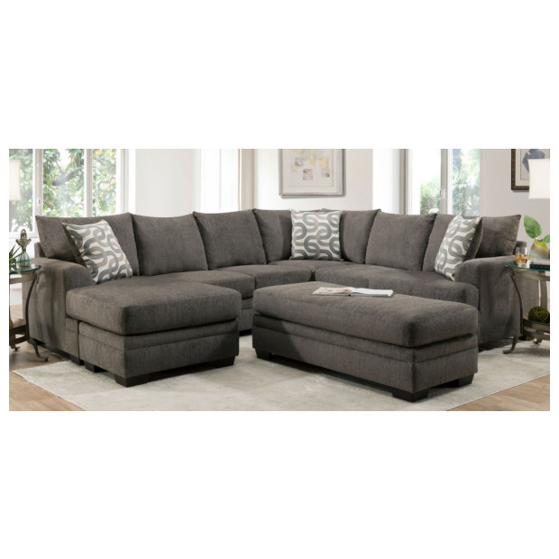 It's love at first touch with this sectional. Stretch out and unwind on the irresistibly soft, spacious cushions. A complementary color palette of charchoal and corresponding accent pillows lend a modern look. The Bailey sectional features loose back and seat cushions in an easy to clean polyester fabric. Ottoman not included.