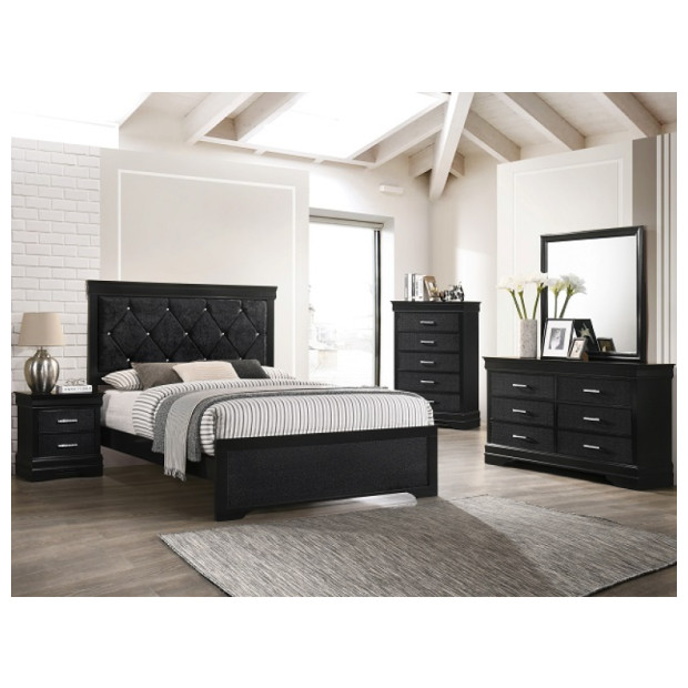 This bedroom set embodies a refined elegance with its rich black hue and luxurious textures, perfect for creating a serene and sophisticated sanctuary. The centerpiece is a sumptuous bed framed by a headboard with diamond-tufted detailing, offering a touch of opulence. The accompanying pieces, including a dresser with a gracefully matching mirror, and nightstand, all feature a textured finish that adds depth and character to the suite.