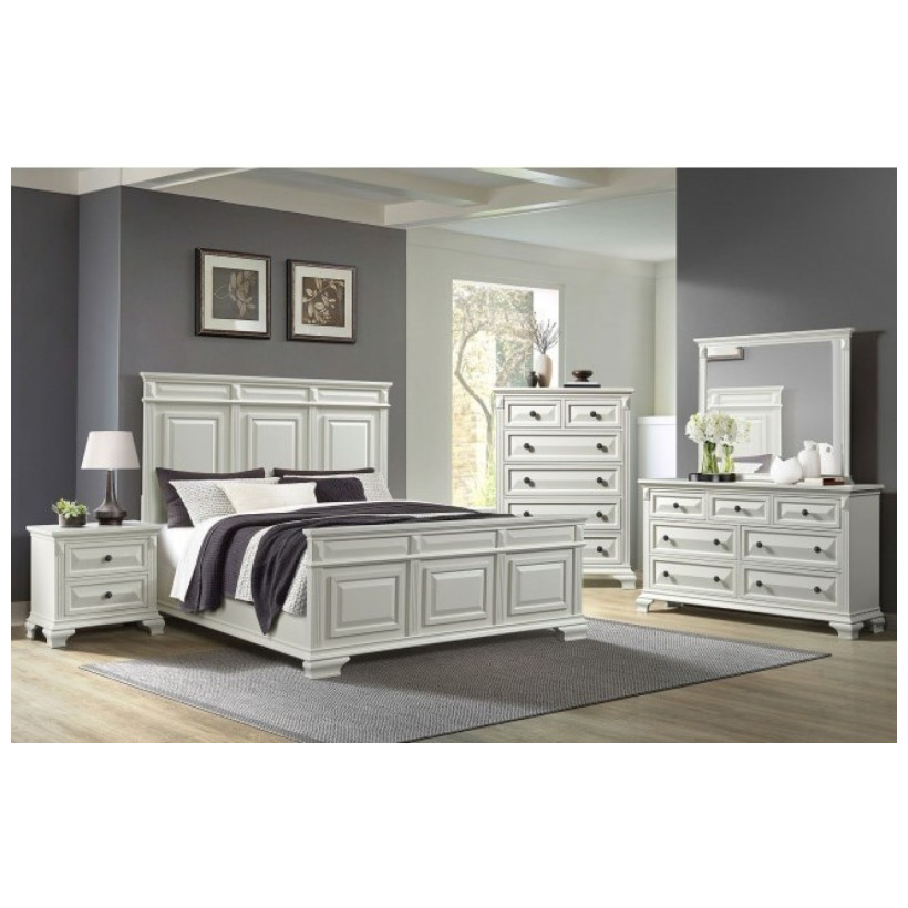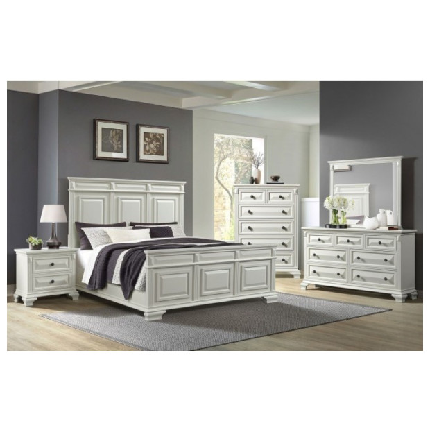 This luxurious antique off-white finish and tri-panel design on the headboard and footboard, this bedroom set will instantly transform your space into a serene sanctuary. The ample drawer space provides plenty of storage for all your essentials, while the sleek metal hardware adds a touch of modernity. includes king bed, dresser, nightstand and mirror