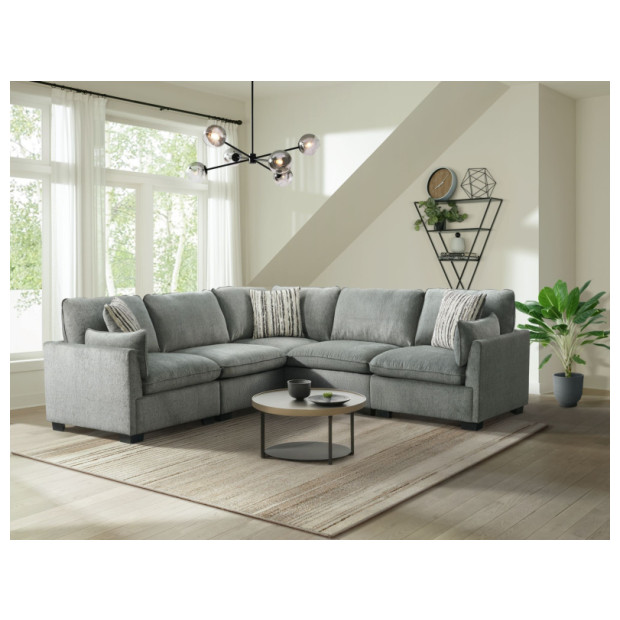 Introducing the Deville 5-Piece Modular Set in Nova Grey, a stunning ensemble that combines flexibility with chic, contemporary design. This modular set offers an array of configuration options to fit your space and meet your needs, perfect for those who value both style and adaptability in their living area. Crafted in a soothing Nova Grey fabric, each piece features plush cushions that invite you to relax and unwind. The set is complemented by a selection of decorative pillows in the Mix Moonlight pattern, adding a touch of elegance and contrast with their intricate designs and textures.